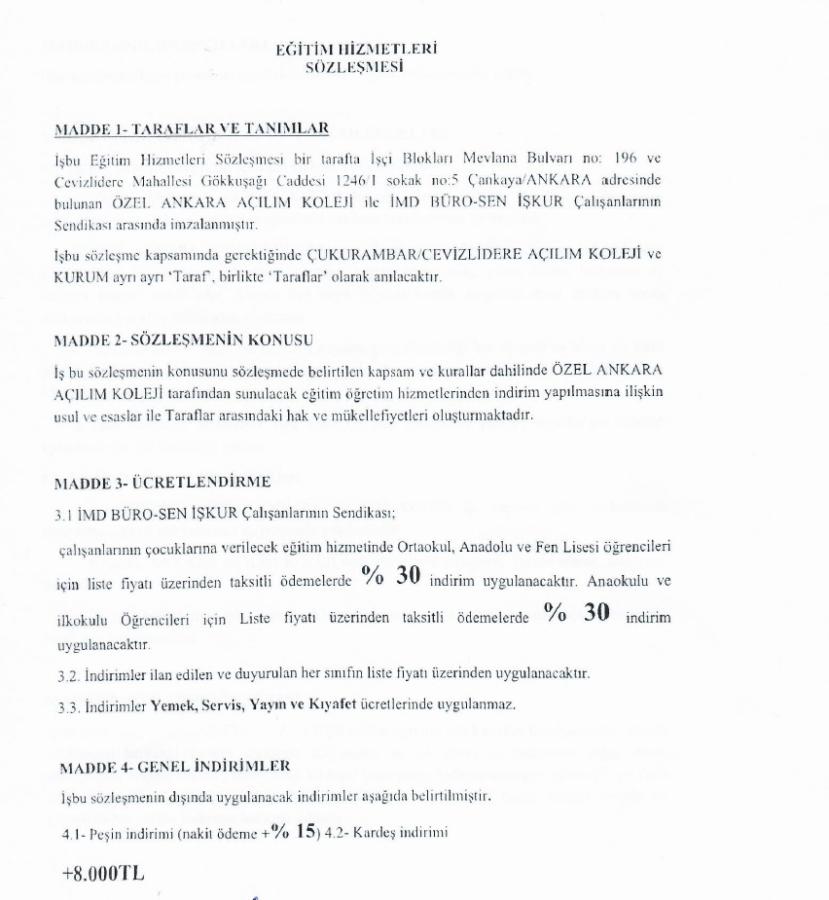 çalışanlarının çocuklarına verilecek eğitim hizmetinde Ortaokul, Anadolu ve Fen Lisesi öğrencileri için liste fiyatı üzerinden taksitli ödemelerde % 30 indirim uygulanacaktır.