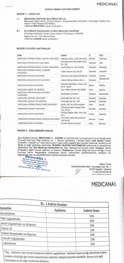 Medicana International Ankara Hastanesi’nde, İş ve Meslek Danışmanları ve Büro Memurları Sendikası üyeleri ve birinci derece yakınlarına özel koşullarla sunulan sağlık hizmetlerinden faydalanabilirsiniz.