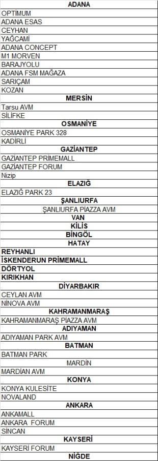 Geçerli olan mağazalar aşağıdadır.