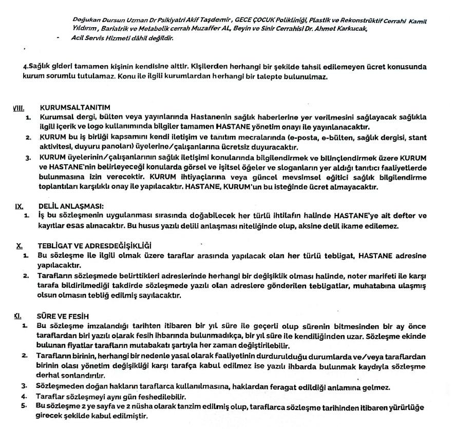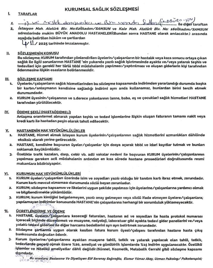 Üyelerimize ayaktan muayene tahlil,tetkik ve yatarak yapılacak olan tahlil,tetkik tedavilerinde geçerli olmak üzere %20, ameliyat ve günübirlik işlemlerde %15 indirim uygulanacaktır. Özellikli işlemler ve nitelikli ameliyatlar dahil değildir.(Sünnet, Kozmetik, Metabolik Cerrahi gibi) sözleşme kapsam dışındadır.