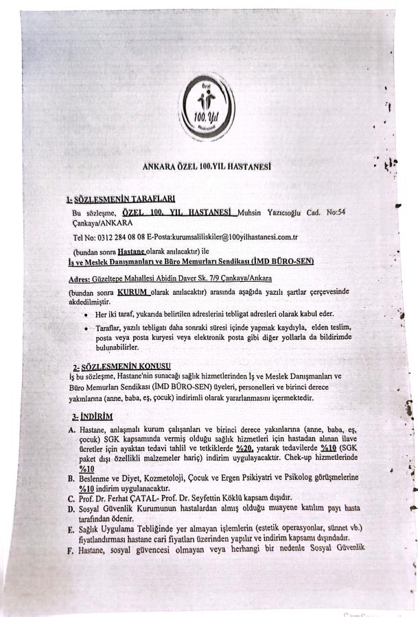 İMD Büro-Sen ile Özel 100. Yıl Hastaneleri arasında yapılan protokol kapsamında; İMD Büro-Sen üyeleri, emekli üyeleri çalışanları ve birinci derece yakınları yüzde 20'e varan oranlarda indirimden faydalanabileceklerdir.
