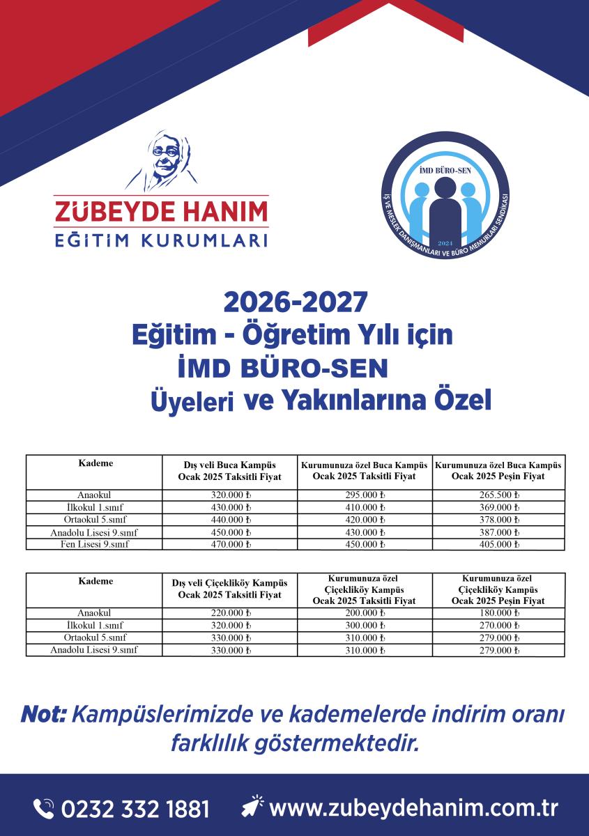İMD Büro-Sen ile Özel Zübeyde Hanım Eğitim Kurumları oarasında kurumsal indirim anlaşması yapılmıştır.